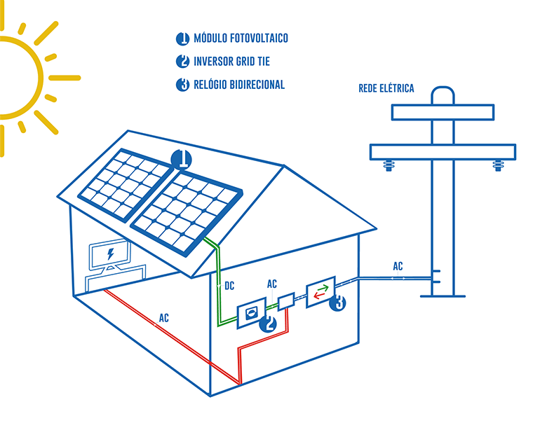 Durante o dia, os Módulos Fotovoltaicos convertem a luz solar em energia elétrica na forma de corrente contínua. Essa corrente contínua chega ao inversor que a transforma em corrente alternada, adequada para o consumo dos aparelhos elétricos e sincroniza com a rede elétrica.